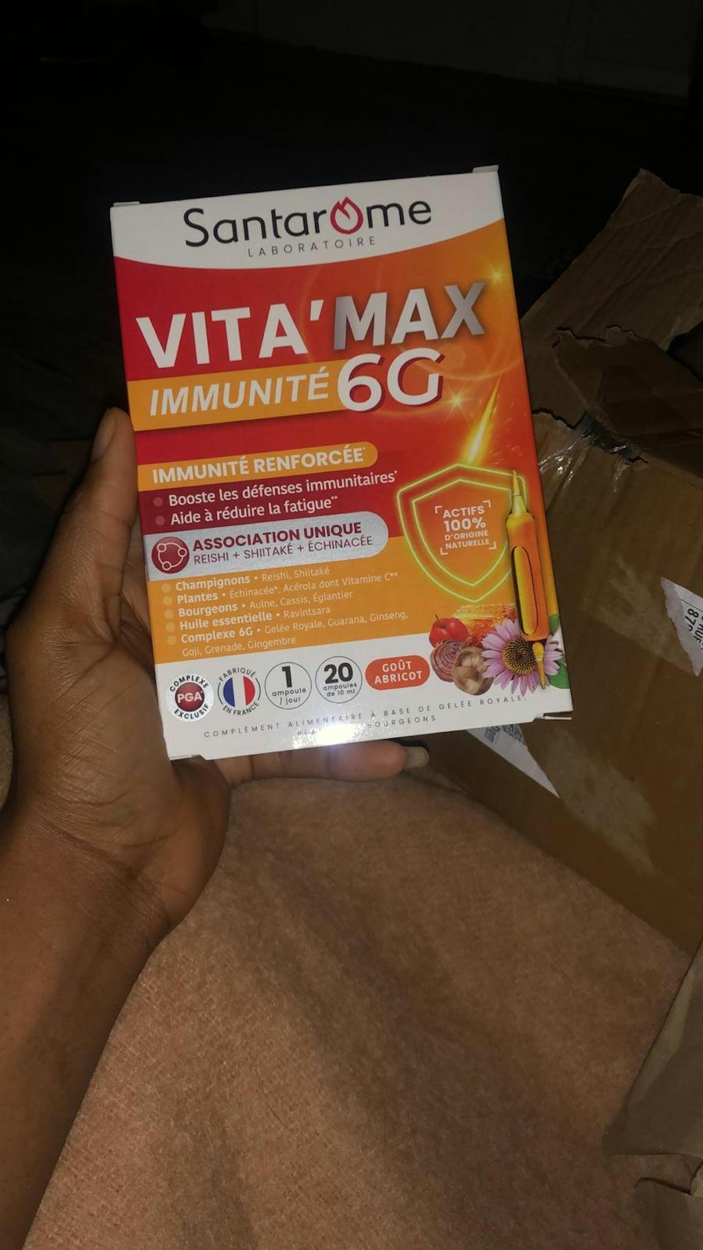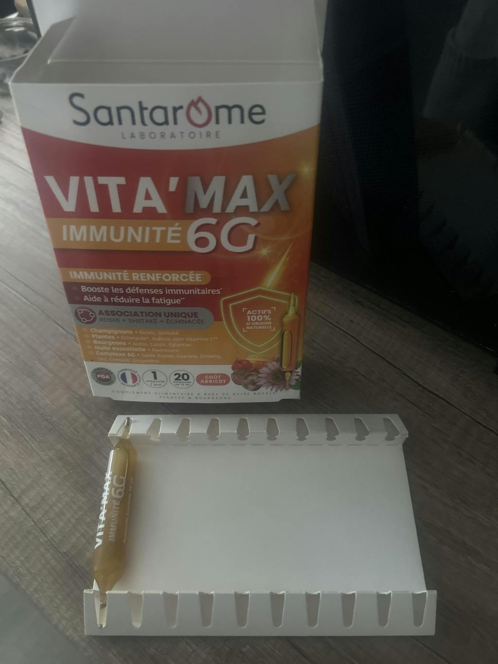 Si vous êtes fatigué, épuisé c'est le produit qu'il vous faut pour y remédier .Comme l'indique son nom Vita'Max Booster ,il vous booste énergiquement parlant et renforce votre immunité.Vous aviez 20 ampoules avec goût abricot dans la boite et vous n'en prendrez qu'une par jour . Ce produit est un complément alimentaires 100% naturel .